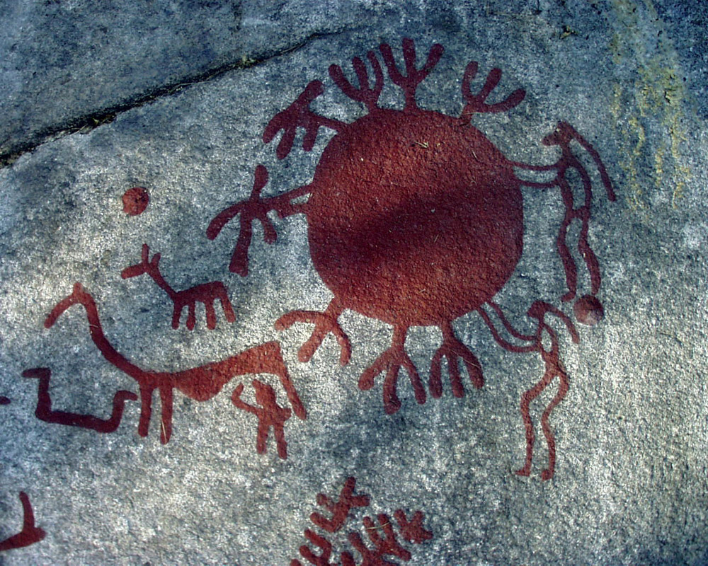 The first panel also has one of the most remarkable of Bohuslän’s many symbols of the sun; a round disc with fork-like sunbeams. The disc is held by two female figures, opposite them are two other figures of unknown gender. This image is unique in Scandinavia. Similar sun discs have been seen on Bronze Age ceramics, found on Bornholm.
