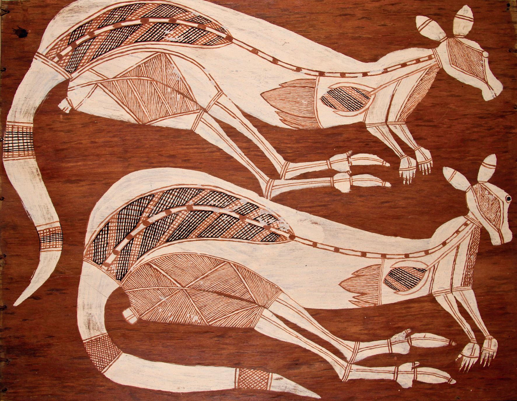 For at least 4000 years Australian Aboriginal artists of the Top End of the Northern Territory have been depicting creatures by showing both internal and external features of the body. This began by including empty body cavities in otherwise solid or stroke infill paintings of animals and occasionally backbones represented with a thin line through a central body cavity (Figure 1; Taçon 1987, 1989a, 1989b). Over time the concern about the insides of things grew so that when Europeans arrived in this part of Australia, in the early to mid 1800s, artists were producing elaborately detailed works on rock walls and sheets of bark that showed many organs, bones and other internal aspects of anatomy of not only animals but also human figures. These designs delineate many features of bodies, in both naturalistic and abstract ways, with some paintings akin to scientific diagrams.