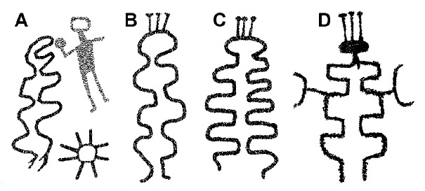 It is understandable that - in general - the design of the ‘pipette’ in the rock art of North and South America will at first sight be described as a non-figurative figure. It is a typically stacked design comprising (near) rectangular boxes, joined by a narrow passage (Russell and Wright 2008: Fig. 4n). However, there are several instances where such pipettes clearly appear to have been anthropomorphised (by the same hand at the same time, or possibly [much] later); at least to our western minds. This may have been achieved rather subtly by adding just two dots or small circles for eyes and in some cases a nose and a mouth (Russell and Wright 2008: Fig. 5o), or more unequivocally by - for instance - adding arms and legs or feet. In my opinion some (but definitely not all) of those anthropomorphised pipettes should be admitted as true anthropomorphic figures as well. However, there is much confusion as to what to accept as a pipette.