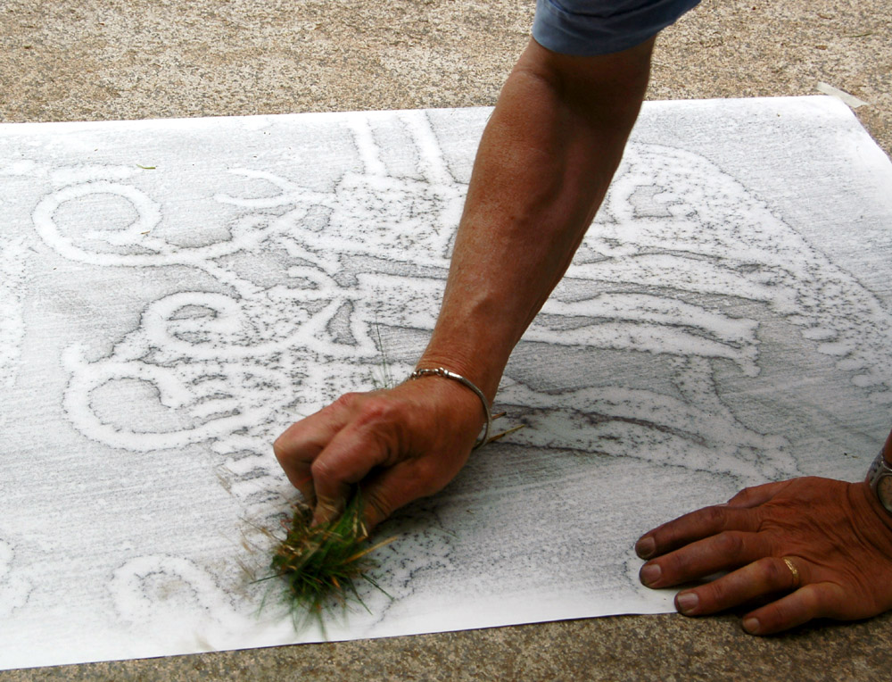 The images are covered by a sheet of paper, and rubbing is carried out with the use of carbon paper and grass