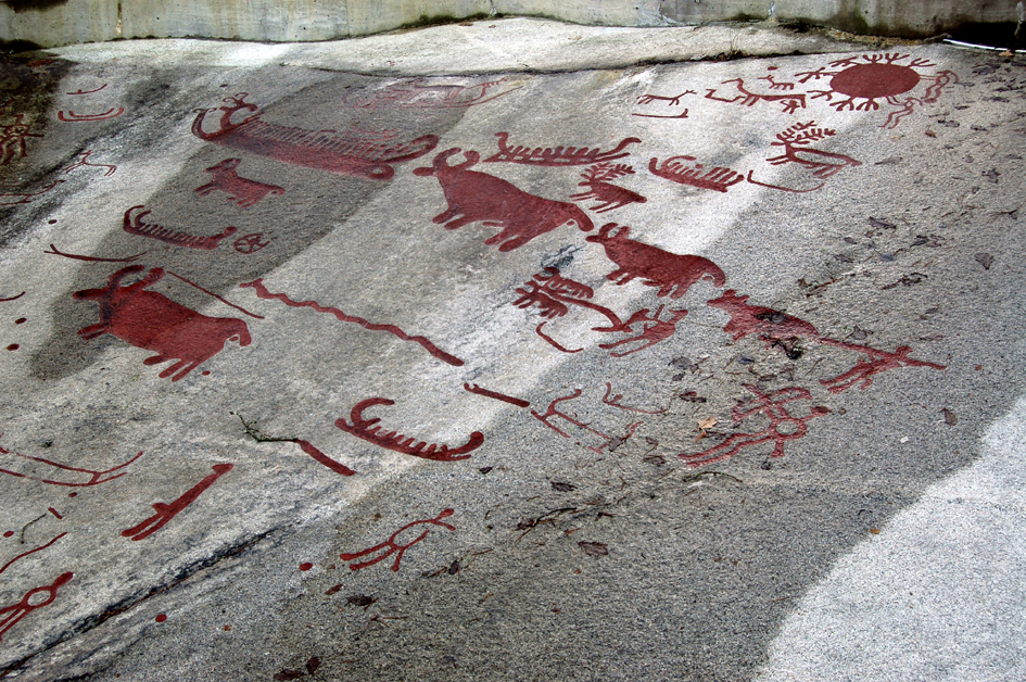 At the end of the path is a large carving that shows a procession of ten men and a woman with her hair in a braid. This is probably a dance. Ritual dancing and music were very important features in the ceremonial lives of people at this time. Horns are found in many rock carvings and around 40 bronze horns have been found, usually in pairs, in southern Scandinavia.
