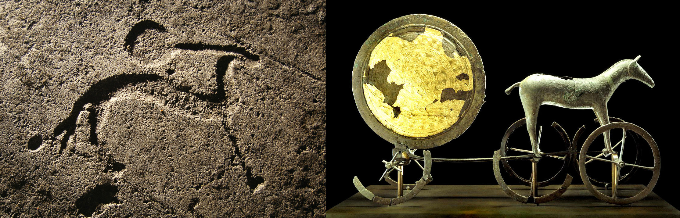 At this time, people knew nothing about the rotation of the earth, but they were able to watch the way the sun moves from left to right, from sunrise in the east to sunset in the west. The horse-drawn sun is a visualisation of their thoughts on the way the sun moves across the sky. The Sun Horse is depicted with a rope connected to a round disk – the sun. The direction, in which it moves, from left to right, is consistent across the many versions of this image.